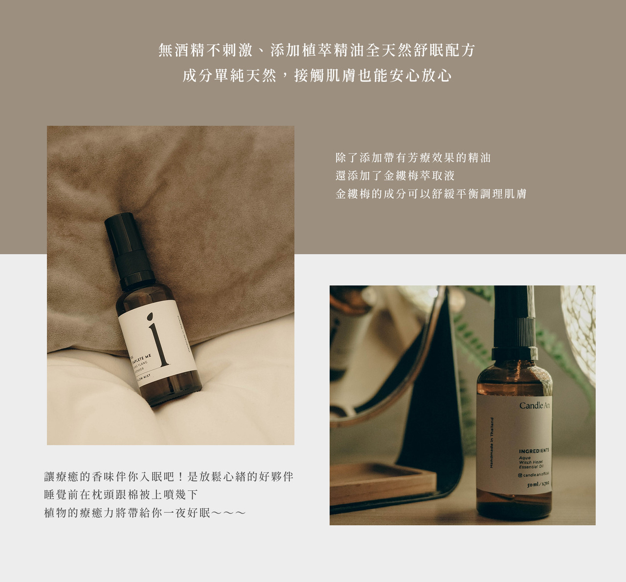 無酒精不刺激、添加植萃精油全天然舒眠配方,成分單純天然,接觸肌膚也能安心放心。